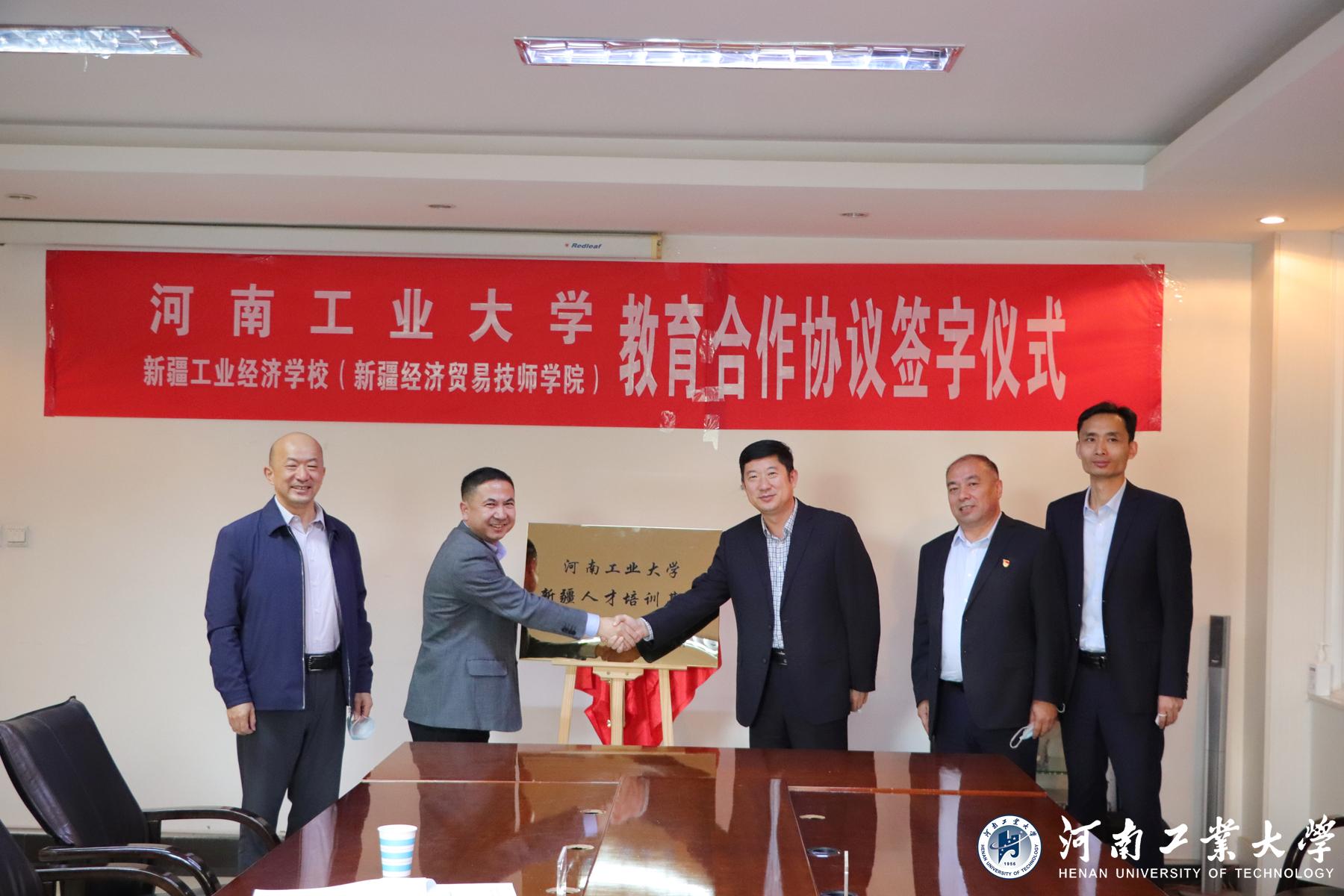 為認真貫徹習近平新時代中國特色社會主義思想和中央治疆方略,深入落實河南省委、省政府新一輪對口援疆要求,充分發揮學校在糧食行業的辦學特色與優勢,進一步助力邊疆教育發展,加強豫疆兩地院校合作交流。9月23日下午,河南工業大學與新疆工業經濟學校(新疆經濟貿易技師學院)教育合作協議簽字儀式在新疆工業經濟學校如期舉行,“河南工業大學新疆人才培訓基地”在簽字儀式上正式揭牌。副校長李煥鋒,遠程與繼續教育學院院長劉克非,標準化與質量檢測中心主任王殿軒,信息科學與工程學院計算中心主任肖樂,新疆維吾爾自治區糧食和物資儲備局黨委委員、副局長馬雪淵,新疆工業經濟學校領導班子成員與相關系部處室負責人參加了簽約揭牌儀式。