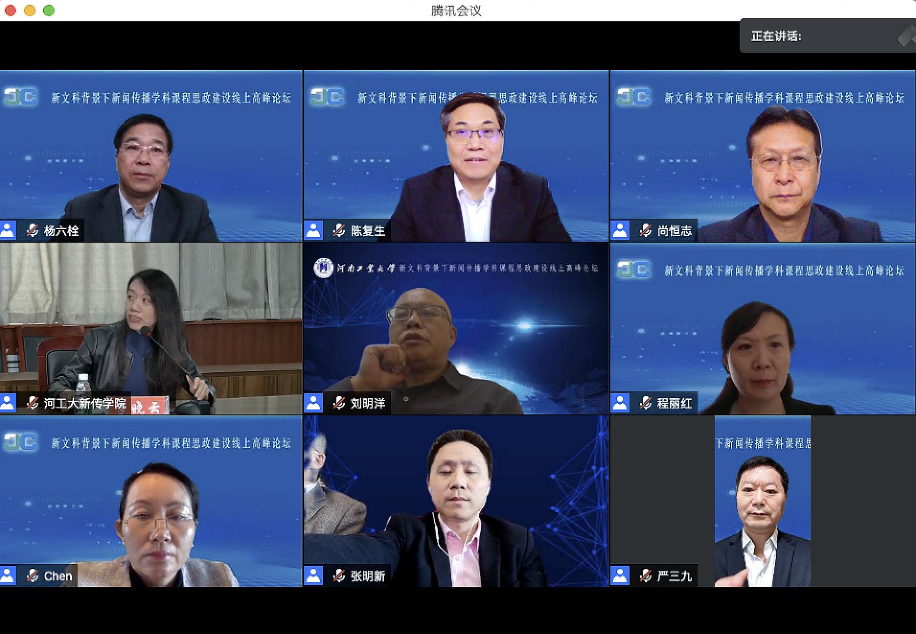 2020年10月27日,“新文科背景下新聞傳播學科課程思政建設線上高峰論壇”在河南工業(yè)大學新聞與傳播學院隆重開幕。此次會議由河南工業(yè)大學新聞與傳播學院主辦,以“線上為主、線下為輔,線上線下相結合”的方式進行。應邀參會的專家有清華大學新聞與傳播學院常務副院長陳昌鳳、上海大學新聞傳播學院院長嚴三九、華中科技大學新聞與信息傳播學院院長張明新、遼寧大學新聞與傳播學院院長程麗紅、山東大學新聞傳播學院常務副院長劉明洋。河南工業(yè)大學副校長陳復生、教務處處長楊六栓出席論壇,學院領導班子成員及部分教師、學生代表參加會議。會議由院長李曉云主持。
