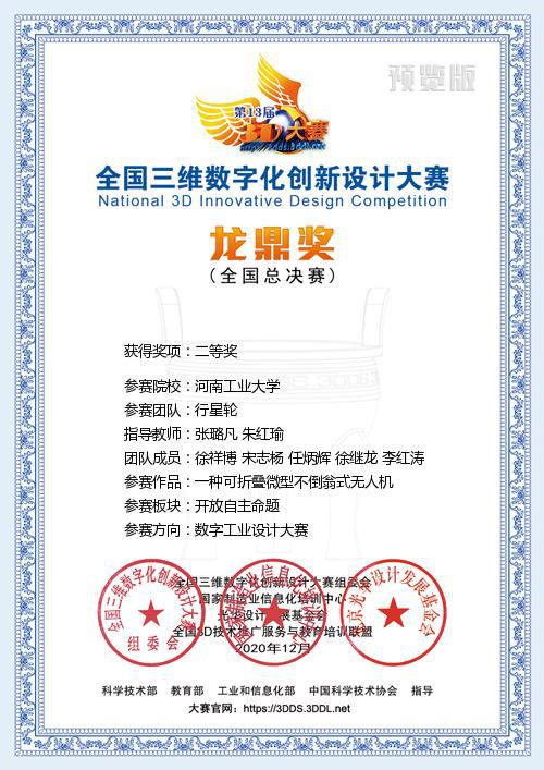 近日,由全國三維數字化技術推廣服務與教育培訓聯盟(3D動力)發起舉辦,由國家科技部、工信部、教育部、中國科協等部門指導的第十三屆全國數字化創新設計大賽全國總決賽落下帷幕。機電工程學院由張璐凡、朱紅瑜兩位老師指導,徐祥博、宋志楊、任炳輝、徐繼龍、李洪濤等五位學生參加的作品“一種可折疊不倒翁式無人機”斬獲全國二等獎。