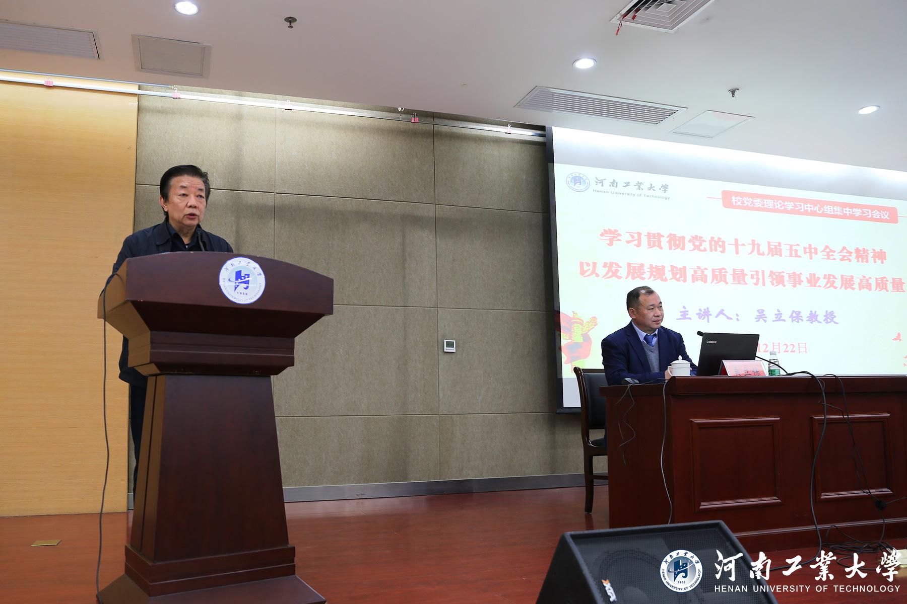 李學雷在主持會議時強調,要提高政治站位,堅持以習近平新時代中國特色社會主義思想為指導,深入學習領會黨的十九屆五中全會精神,深刻領會精神實質和核心要義,為實現“十四五”時期事業發展高質量做好充分的政治準備、思想準備。要突出政治責任,通過理論宣講、專題培訓、集中學習、研討交流等方式,抓好黨的十九屆五中全會精神的學習領會、理論宣講和思想闡釋工作,切實做到宣傳教育分層次、廣覆蓋。要強化政治擔當,緊緊圍繞立德樹人根本任務,廣泛調研、深入研討,精心謀劃、系統謀劃學校發展藍圖,把黨的十九屆五中全會精神貫徹落實到學校“十四五”發展總體規劃、專項規劃和學院規劃當中,以發展規劃高質量引領事業發展高質量,努力辦人民滿意的高等教育。
