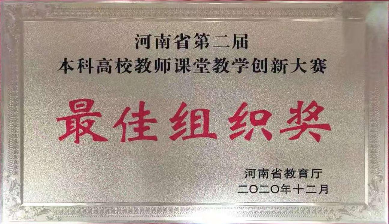 近日,第二屆河南省本科高校教師課堂教學創新大賽在河南師范大學圓滿落幕,全省58所本科高校,共282名教師參加角逐,經過競賽專家委員會評審,省教育廳審定,最終評選出特等獎33人,一等獎59人,二等獎109人。我校推薦參賽9名教師,經過省級復賽、決賽,最終全部獲獎,其中獲特等獎1名、一等獎4名、二等獎4名。學校榮獲最佳組織獎。