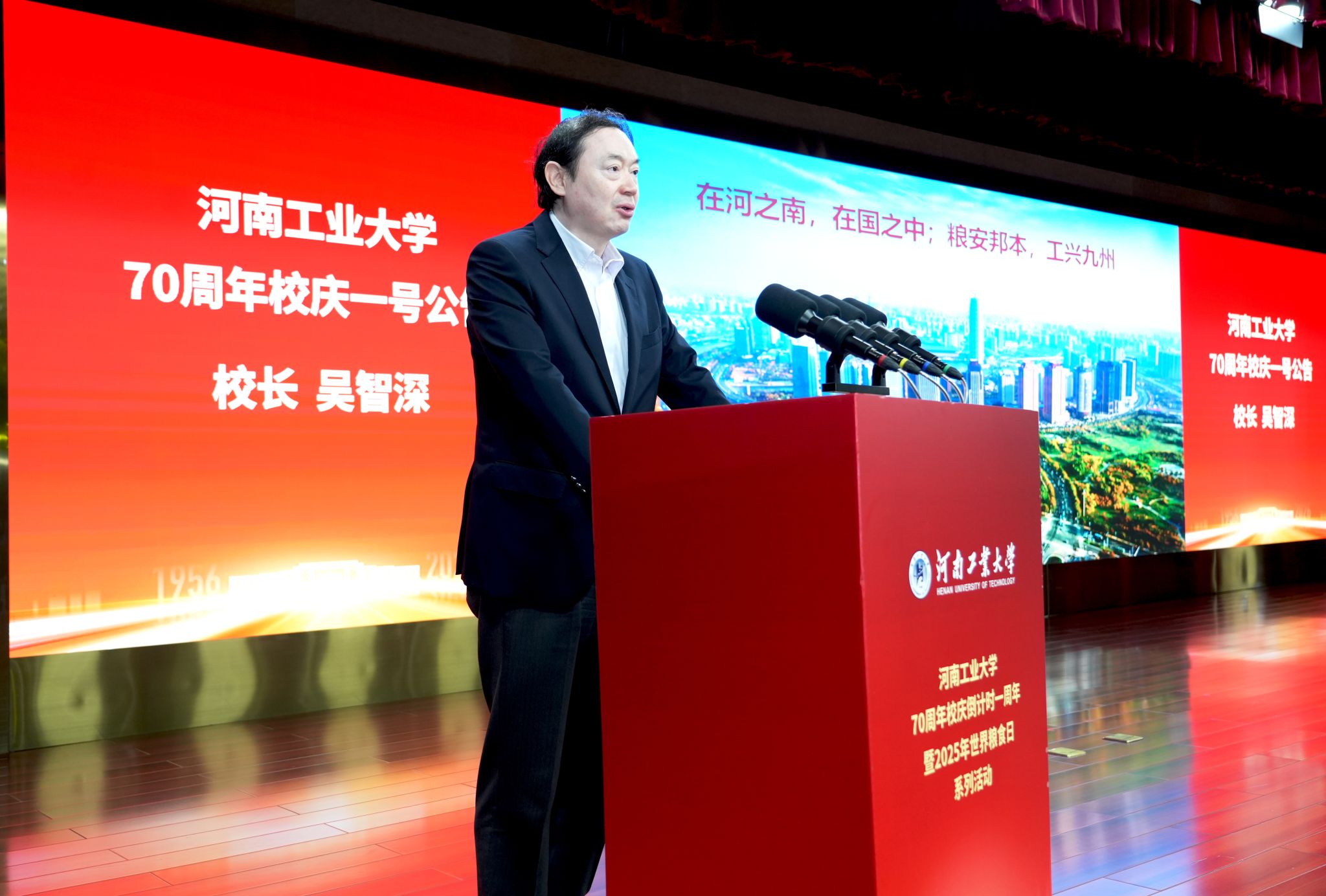 會上,校長吳智深現場宣讀校慶一號公告。公告回顧了學校“薪火相承,興學報國”的辦學歷史,勾勒了學校“糧安邦本,工興九州”的奮進畫卷,發出了“廣聚賢達,同擘宏圖”的真摯邀約。公告宣示河南工業大學將以70周年校慶為契機,回眸一路芳華,展望美好愿景,凝聚奮進共識,廣結深情厚誼,開啟特色鮮明的一流工業大學建設新篇章。